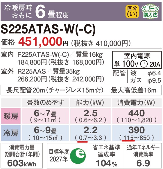 最低能力:0.4kW、最低消費電力115Wです。